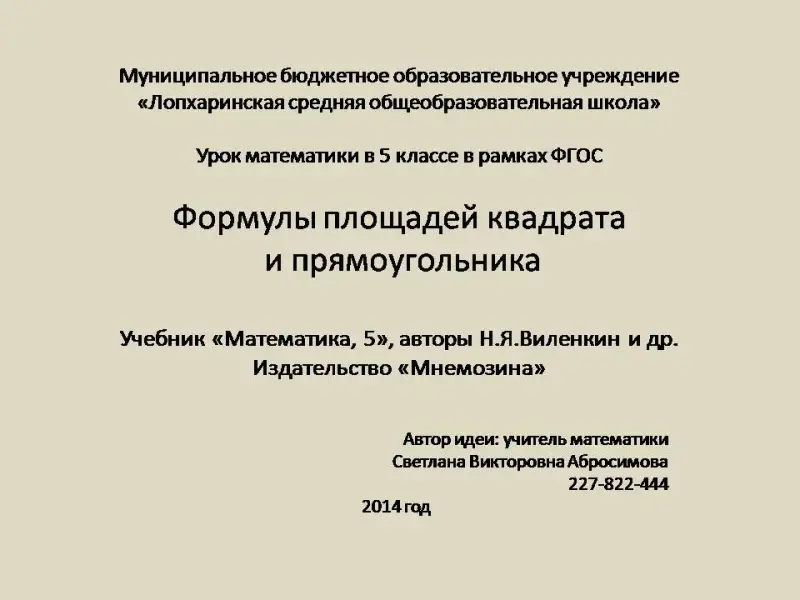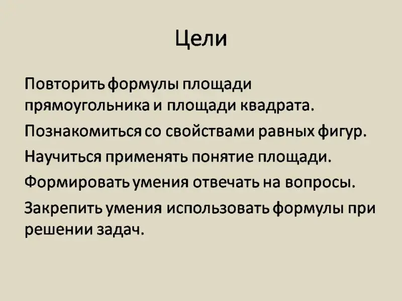Цели: Изучить формулы площади прямоугольника и площади квадрата. Познакомиться со свойствами равных фигур. Научиться применять понятие площади. Формировать умения отвечать на вопросы. Закрепить умения использовать формулы при решении задач.