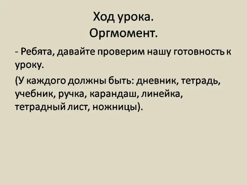 (У каждого должны быть: дневник, тетрадь, учебник, ручка, карандаш, линейка, тетрадный лист, ножницы).