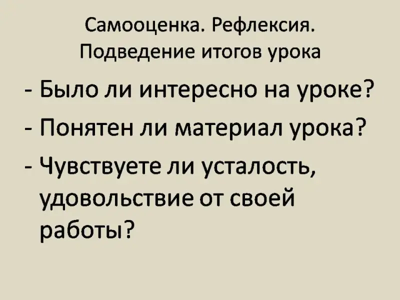 - Было ли интересно на уроке? Понятен ли материалурока? Чувствуете ли усталость, удовольствие от своей работы?