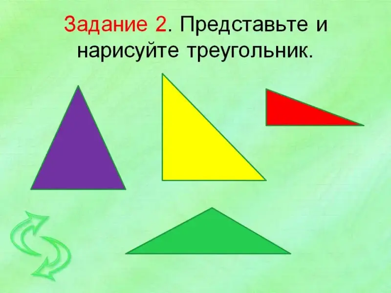 Задание 2. Представьте треугольник и нарисуйте его на листе. Давайте посмотрим на ваши рисунки. (Учитель вывешивает рисунки на доске). У нас получились одинаковые треугольники? Скажите, а