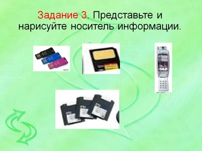 Задание 3. Представьте мысленно носитель информации, нарисуйте этот носитель информации на листе бумаги. Давайте посмотрим какой образ у вас получился (учитель вывешивает рисунки на доске).