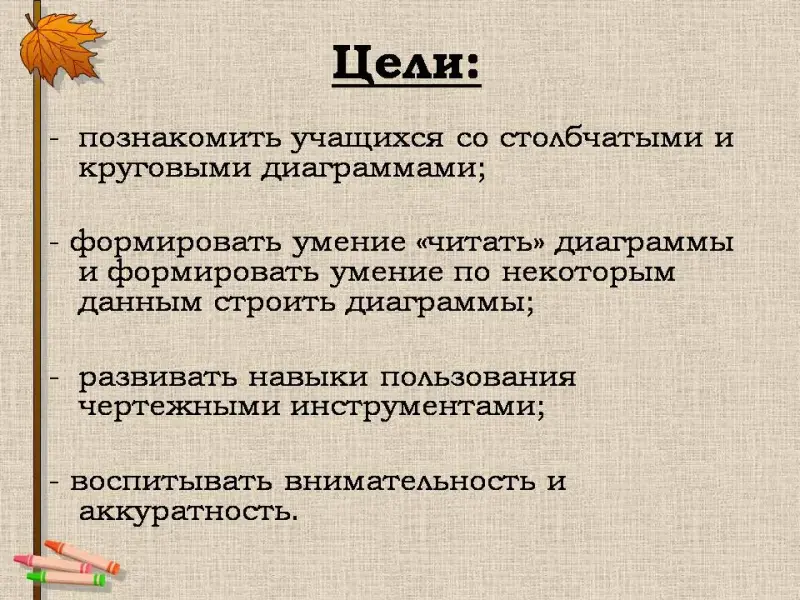 - познакомить учащихся со столбчатыми и круговыми диаграммами;