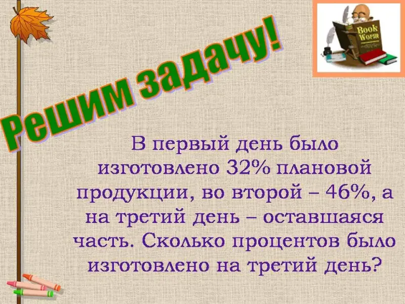 2. В первый день было изготовлено 32% плановой продукции, во второй - 46%, а на третий день - оставшаяся часть. Сколько процентов было изготовлено на третий день?