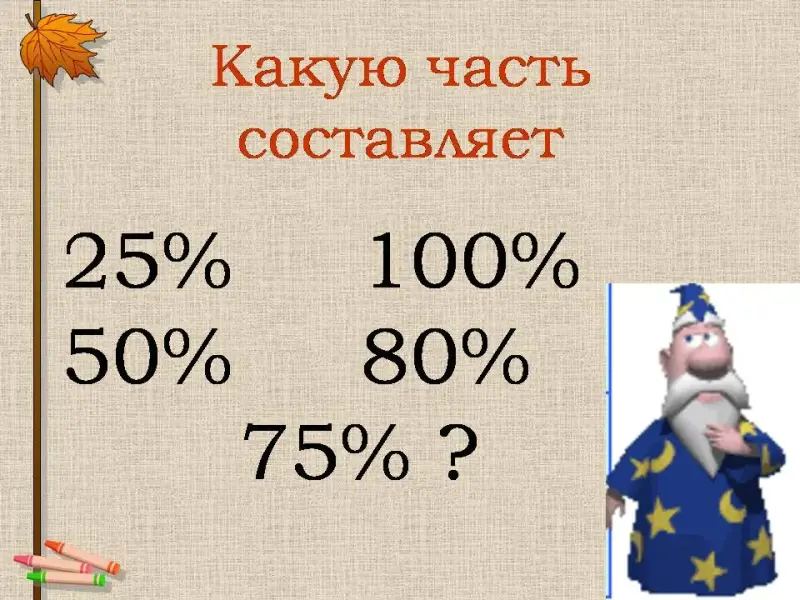3. Какую часть составляет 25%, 100%, 50%, 25%, 75%?