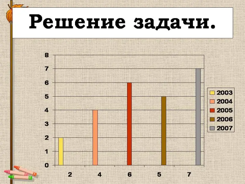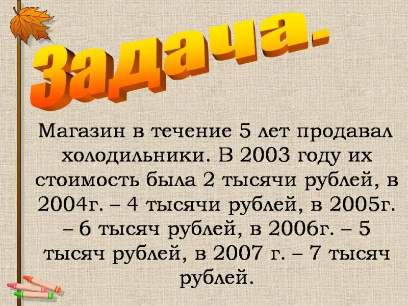 Учитель:Мы имеем информацию о том, как магазин в течение 5 лет продавал холодильники. В 2003 году их стоимость была 2 тысячи рублей, в 2004г. - 4 тысячи рублей, в 2005г. - 6 тысяч рублей, в 2006г. - 5 тысяч рублей, в 2007 г. - 7 тысяч рублей.