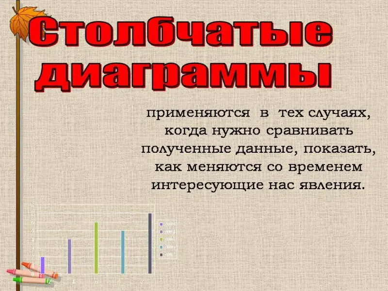 Столбчатые диаграммы применяются в тех случаях, когда нужно сравнивать полученные данные, показать, как меняются со временем интересующие нас явления.