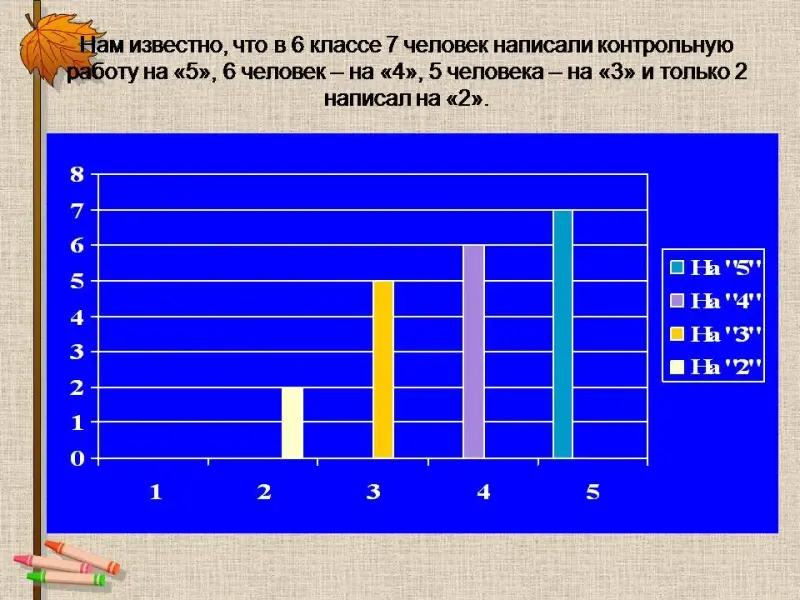 Нам известно, что в 6 классе 7 человек написали контрольную работу на «5», 6 человек - на «4», 5 человека - на «3» и только 2 написал на «2».