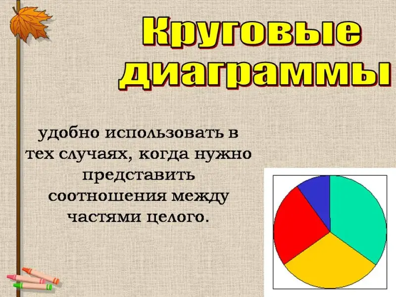 Круговые диаграммы удобно использовать в тех случаях, когда нужно представить соотношения между частями целого.