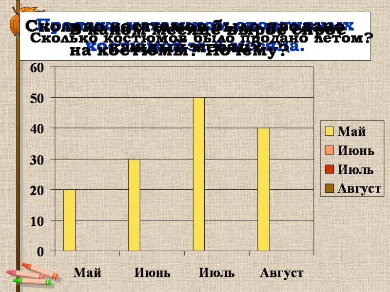 Учитель: 1. На столбчатой диаграмме показано, сколько было продано магазином спортивных костюмов за 4 месяца.
