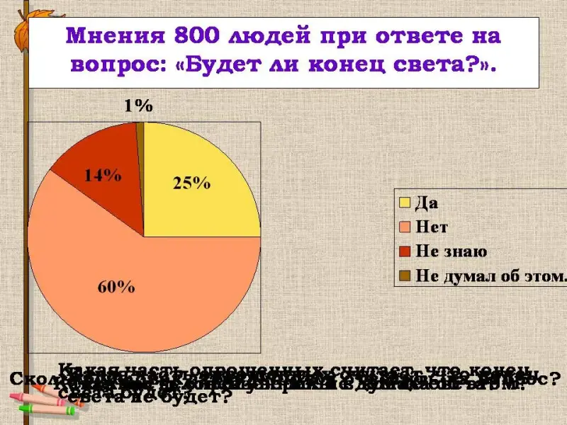 2. На круговой диаграмме показано, как распределились мнения 800 людей при ответе на вопрос: «Будет ли конец света?».