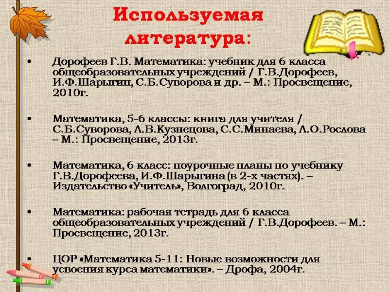 - Дорофеев Г.В. Математика: учебник для 6 класса общеобразовательных учреждений / Г.В. Дорофеев, И.Ф. Шарыгин, С.Б. Суворова и др. - М.: Просвещение, 2010.