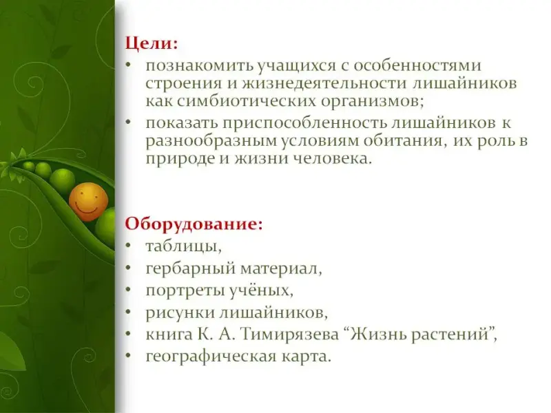 Оборудование: таблицы, гербарный материал, портреты учёных, рисунки лишайников, книга К. А. Тимирязева "Жизнь растений", географическая карта.