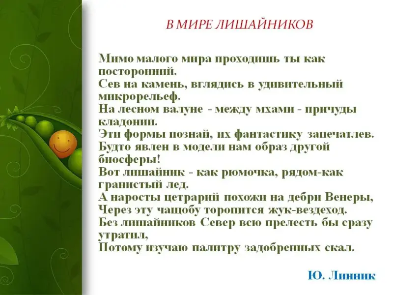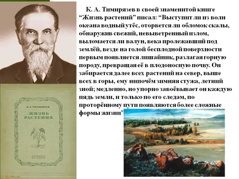 К. А. Тимирязев в своей знаменитой книге "Жизнь растений" писал: "Выступит ли из волн океана водный утёс, оторвется ли обломок скалы, обнаружив свежий, не выветренный излом, выломается ли валун, века пролежавший под землёй, везде на голой бесплодной поверхности первым появляется лишайник, разлагая горную породу, превращая её в плодоносную почву. Он забирается далее всех растений на север, выше всех в горы, ему нипочём зимняя стужа, летний зной; медленно, но упорно завоёвывает он каждую пядь земли, и только по его следам, по проторённому пути появляются более сложные формы жизни". /слайд №17/