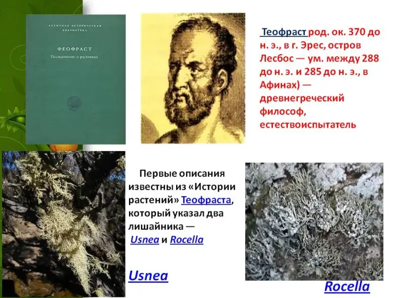 Первые описания лишайников известны из «Истории растений» Теофраста, который указал два лишайника - Usnea и Rocella, /слайд №6/ которую уже тогда использовали для получения красящих веществ. Теофраст предполагал, что они представляют собой наросты деревьев или водоросли. В XVII веке было известно только 28 видов.