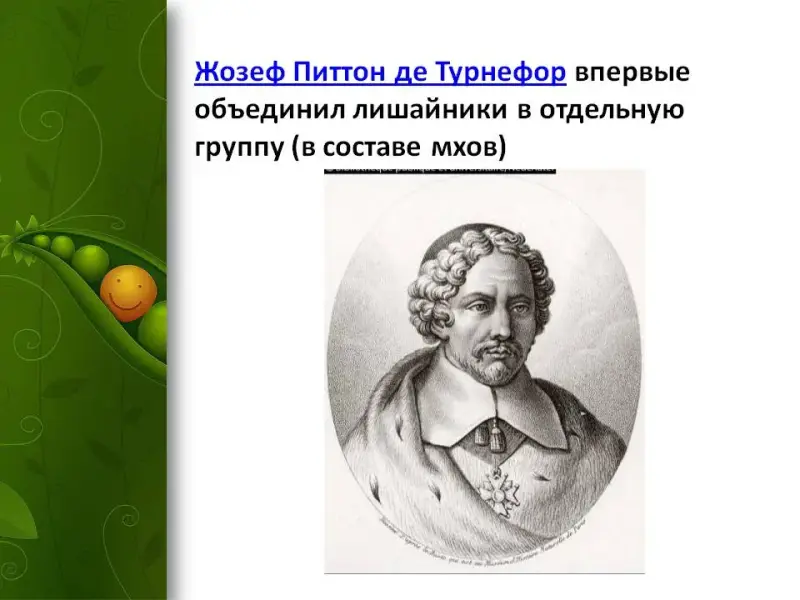 Французский врач и ботаник Жозеф Питтон де Турнефор /слайд №7/ в своей системе выделил лишайники в отдельную группу в составе мхов. Хотя к 1753 году было известно свыше 170 видов, Карл Линней описал только 80, охарактеризовав их как «скудное крестьянство растительности», и включил вместе с печёночниками в состав «наземных водорослей».