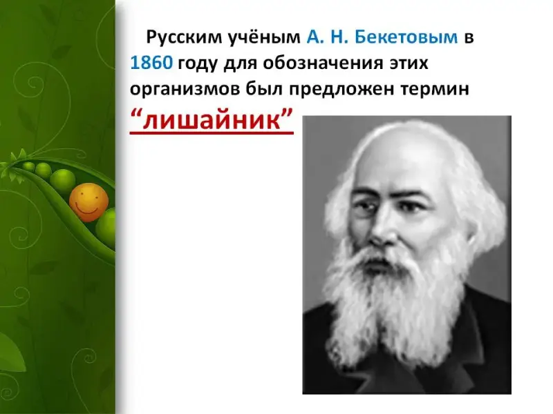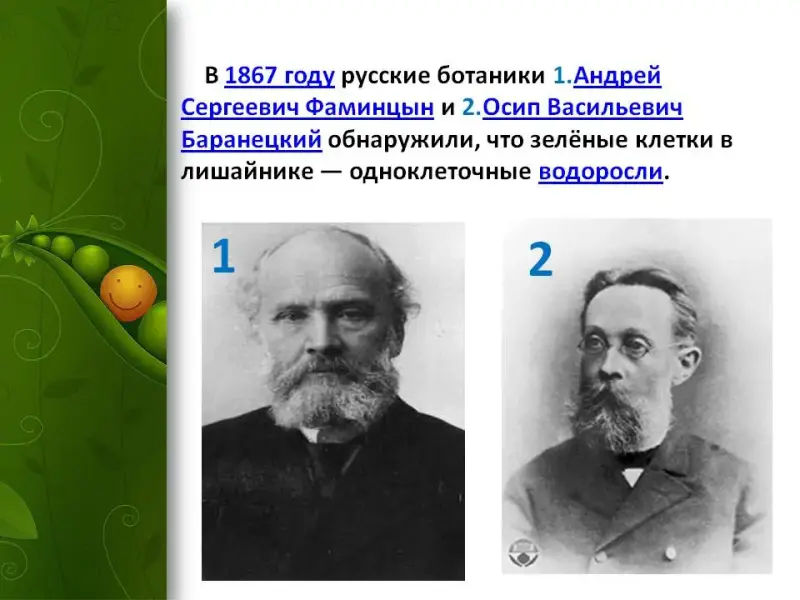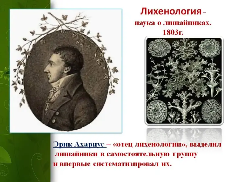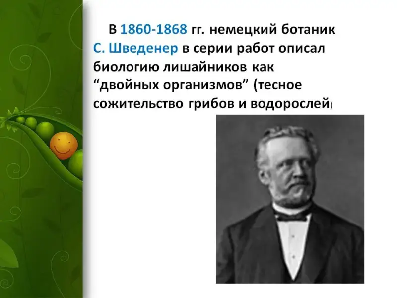 Началом лихенологии (науки о лишайниках) принято считать 1803 год, когда ученик Карла Линнея - Эрик Ахариус /слайд №8/ опубликовал свой труд «Methodus, qua omnes detectos lichenes ad genera redigere tentavit» («Методы, с помощью которых каждый сможет определять лишайники»). Он выделил их в самостоятельную группу и создал систему, основанную на строении плодовых тел, в которую вошли 906 описанных на то время видов. Русским учёным А. Н. Бекетовым в 1860 году для обозначения этих организмов был предложен термин "лишайник"./слайд №9/ В 1860-1868 гг. немецкий ботаник С. Шведенер /слайд №10/ в серии работ описал биологию лишайников как "двойных организмов" (тесное сожительство грибов и водорослей). Первым на симбиотическую природу в 1866 году на примере одного из видов указал врач и миколог Антон де Бари. В1867 году русские ботаники Андрей Сергеевич Фаминцын и Осип Васильевич Баранецкий /слайд №11/ обнаружили, что зелёные клетки в лишайнике - одноклеточные водоросли. Эти открытия были восприняты современниками как «удивительнейшие».