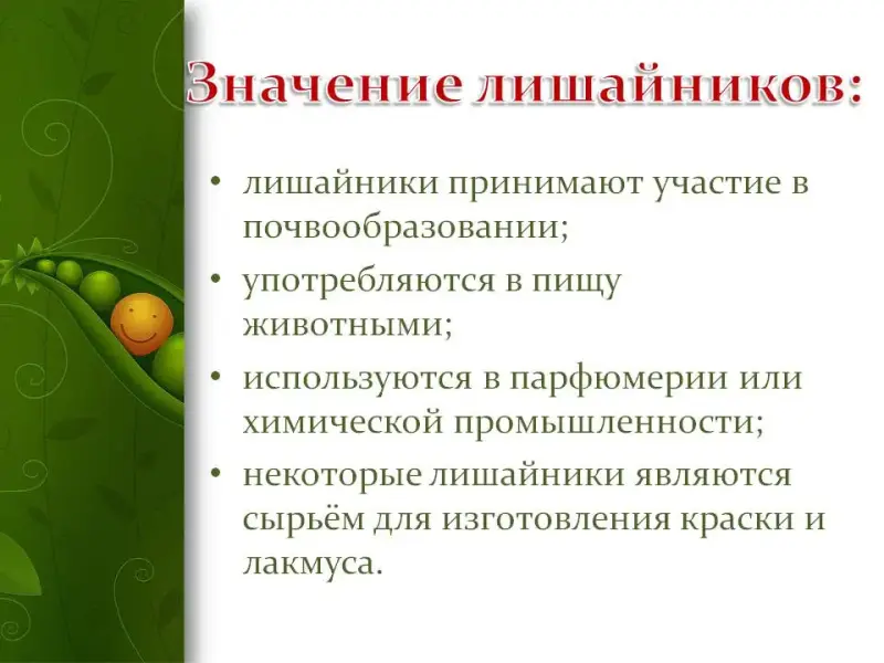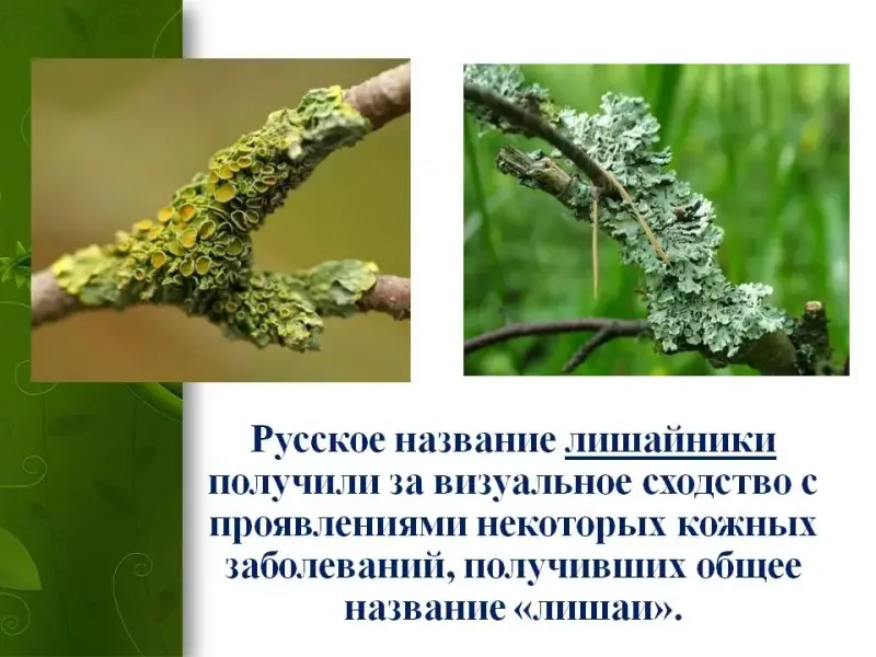 Русское название лишайники получили за визуальное сходство с проявлениями некоторых кожных заболеваний, получивших общее название «лишаи». /слайд №12/