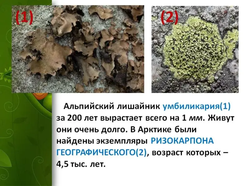 Распространены они по всей суше от полярных пустынь до тропических лесов. При этом лишайники бывают настолько неприхотливыми, что растут там, где другие растения просто не могут выжить - в крайне суровых полярных и высокогорных пустынях, в которых лежат вечные снега, не бывает лета и лишь оголенные ветрами камни и скалы могут оставаться открытыми. Три четверти всех видов лишайников - это довольно микроскопические организмы, изучение которых без специальных оптических приборов невозможно. Большинство видов лишайников в северных широтах - крайне медленно растущие, за год способны прирастать всего на 0,1-2 мм, редко на 3 мм. Поэтому им трудно конкурировать с быстрорастущими мхами и другими высшими растениями. Например, альпийский лишайник умбиликария за 200 лет вырастает всего на 1 мм. Живут они очень долго. В Арктике были найдены экземпляры Ризокарпона географического, возраст которых - 4,5 тыс. лет. /слайд №16/ В 1981 г. было установлено, что возраст некоторых арктических лишайников как минимум 10 тыс. лет.