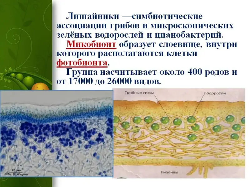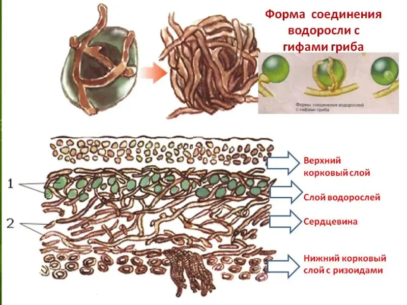 Учитель: Лишайники представляют своеобразную группу комплексных организмов, тело которых всегда состоит из двух компонентов - гриба и водоросли. Сейчас каждый школьник знает, что в