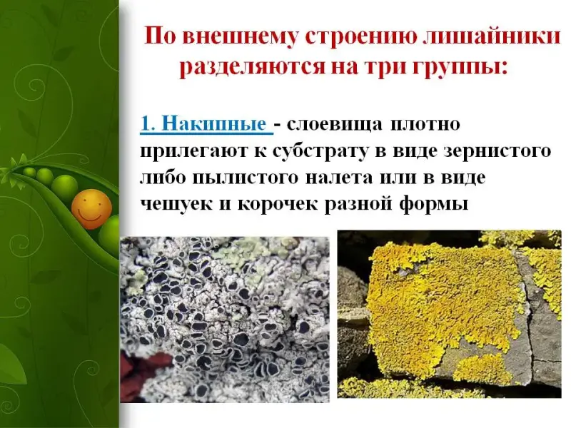 По внешнему строению лишайники разделяются на три группы. Если слоевища плотно прилегают к субстрату в виде зернистого либо пылистого налета или в виде чешуек и корочек разной формы, то такие лишайники называются накипными. /слайд №21/