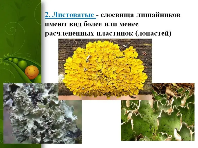 Если слоевища лишайников имеют вид более или менее расчлененных пластинок (лопастей), они называются листоватыми. /слайд №22/