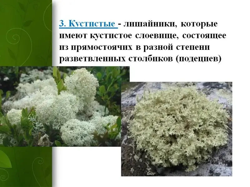 Наконец, лишайники, которые имеют кустистое слоевище, состоящее из прямостоячих в разной степени разветвленных столбиков, называются кустистыми./слайд №23/