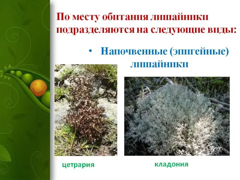 - Напочвенные (эпигейные) лишайники - могут расти как в открытых местах так и в лесах; /слайд №24/