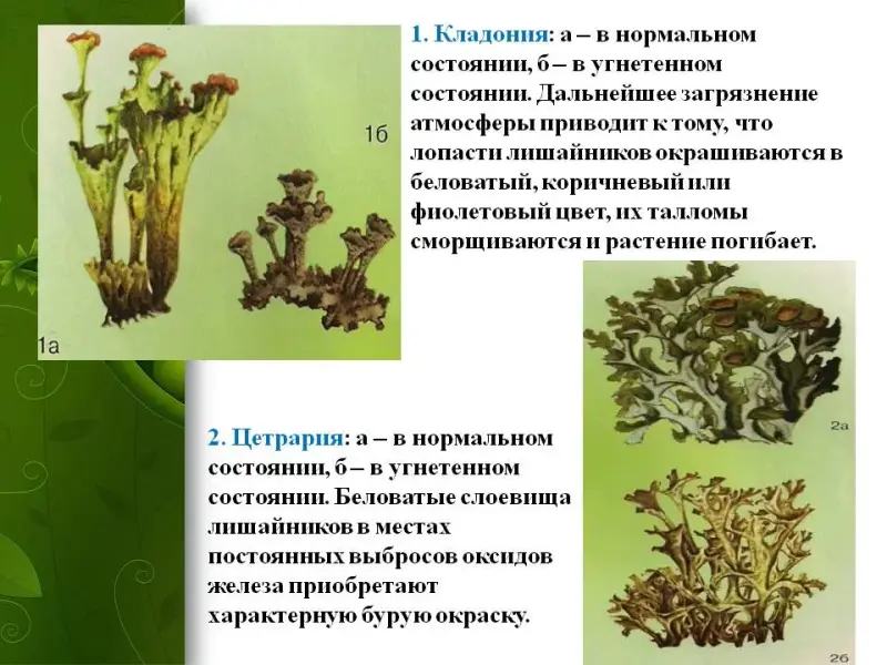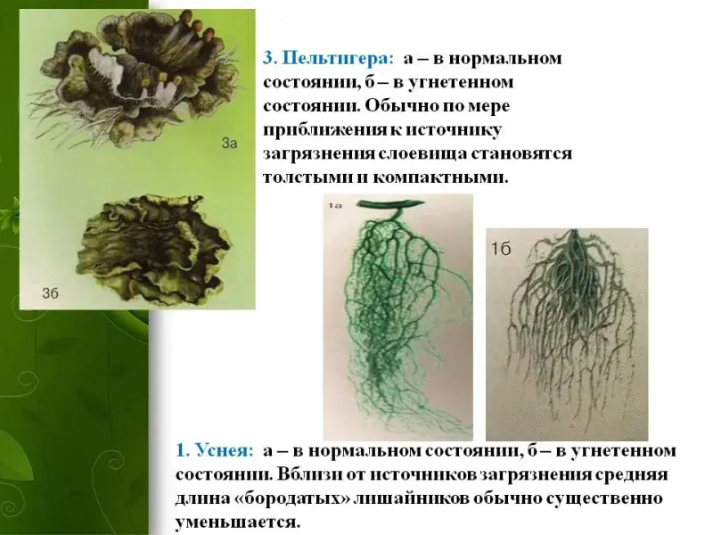 Лишайники, растущие вблизи источников атмосферного загрязнения, если не исчезают совсем, то чаще всего утрачивают свой нарядный, привлекательный вид. На краях лопастей появляется беловатый налет, уменьшается размер слоевищ. На грибных грифах в изобилии появляются бактерии, клетки водорослей уменьшаются в размере, а иногда совсем погибают; бывает, что разрушается весь водорослевый слой таллома. Одним словом, лишайники выглядят больными./слайд №35,36/