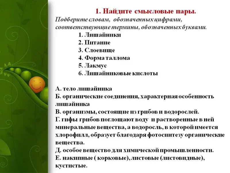 1. Лишайники 2. Питание 3. Слоевище 4. Форма таллома 5. Лакмус 6. Лишайниковые кислоты