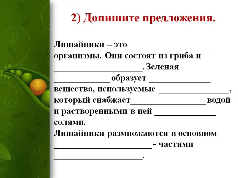 Лишайники - это ___________________ организмы. Они состоят из гриба и ___________________. Зеленая ____________ образует _____________ вещества, используемые _______________, который снабжает________________ водой и растворенными в ней _____________ солями.