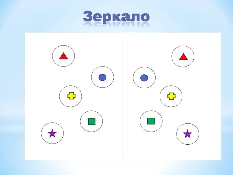 Психолог: Молодцы, друзья. Посмотрите, Знайка приготовил для нас новое задание. Внимательно рассмотрите эту картинку. Вы видите, что здесь с левой стороны рисунка в кружках расположены различные геометрические фигуры, а справа кружки пустые. Расположите справа геометрические фигуры как в зеркале.