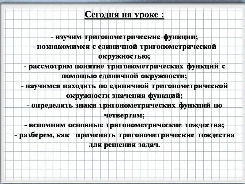 Сегодня на уроке мы продолжим изучать эти тригонометрические функции, а также познакомимся с тригонометрической окружностью, рассмотрим понятие этих функций с помощью окружности, научимся находить по ней значения функций, их знаки, вспомним основные тригонометрические тождества и разберем, как их применять для решения задач.