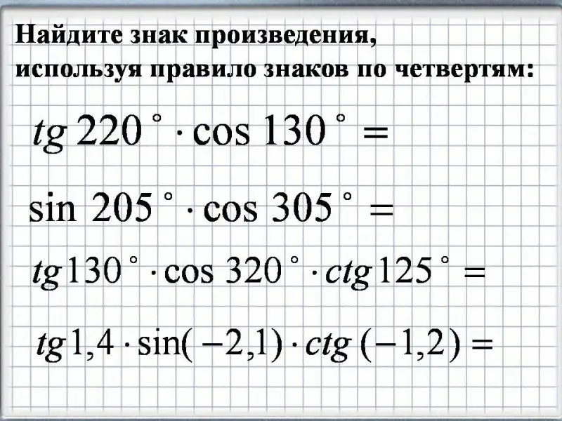 . - Найдите знак произведения, используя правило знаков по четвертям:
