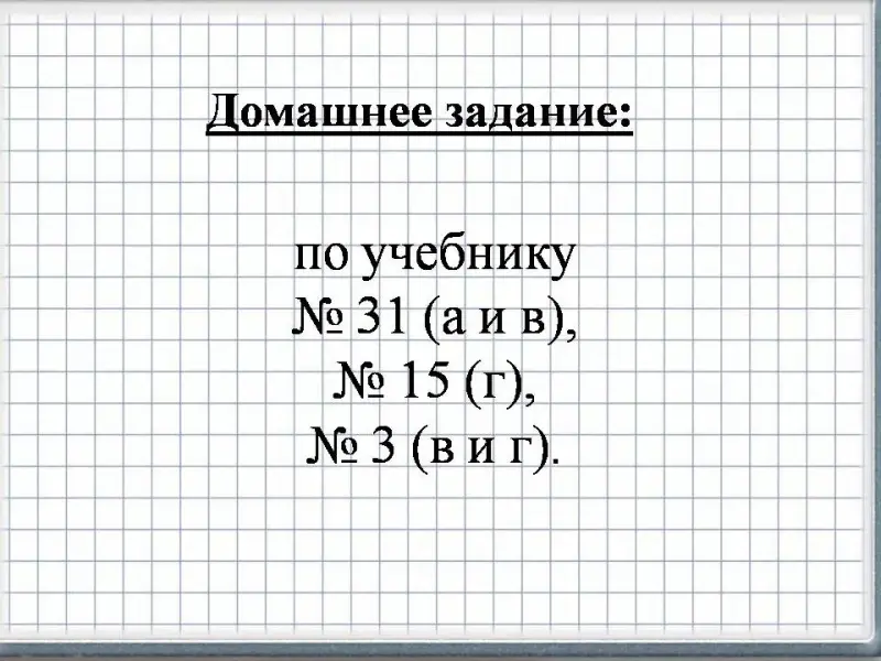 Задание на дом вывести на слайд презентации: по учебнику № 31 (а и в), № 15 (г), № 3 (в и г).