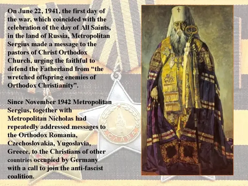 On June 22, 1941, the first day of the war, which coincided with the celebration of the day of All Saints, in the land of Russia, Metropolitan Sergius made a message to the pastors of Christ Orthodox Church, urging the faithful to defend the Fatherland from "the wretched offspring enemies of Orthodox Christianity".