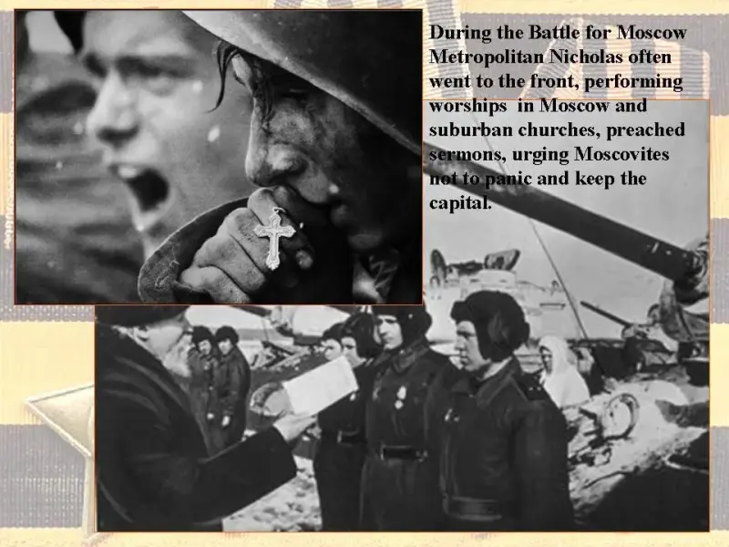 During the Battle for Moscow Metropolitan Nicholas often went to the front, performing worships in Moscow and suburban churches, preached sermons, urging Muscovites not to panic and keep the capital.