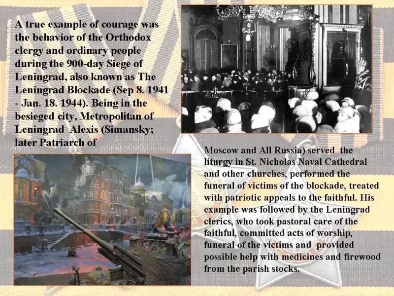 A true example of courage was the behavior of the Orthodox clergy and ordinary people during the 900-day Siege of Leningrad, also known as The Leningrad Blockade (Sep 8. 1941 - Jan. 18. 1944). Being in the besieged city, Metropolitan of Leningrad Alexis (Simansky; later Patriarch of Moscow and All Russia) served the liturgy in St. Nicholas Naval Cathedral and other churches, performed the funeral of victims of the blockade, treated with patriotic appeals to the faithful. His example was followed by the Leningrad clerics, who took pastoral care of the faithful, committed acts of worship, funeral of the victims and provided possible help with medicines and firewood from the parish stocks.