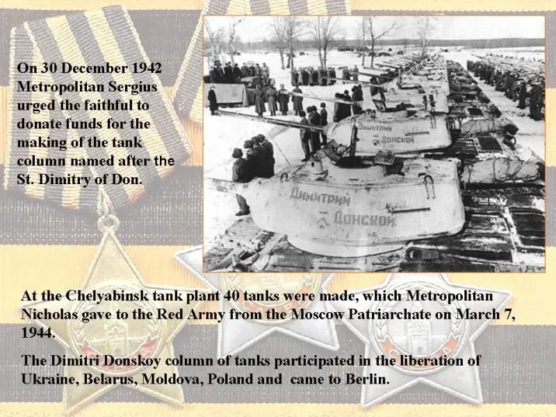 On 30 December 1942 Metropolitan Sergius urged the faithful to donate funds for the making of the tank column named after Dmitry Donskoy.