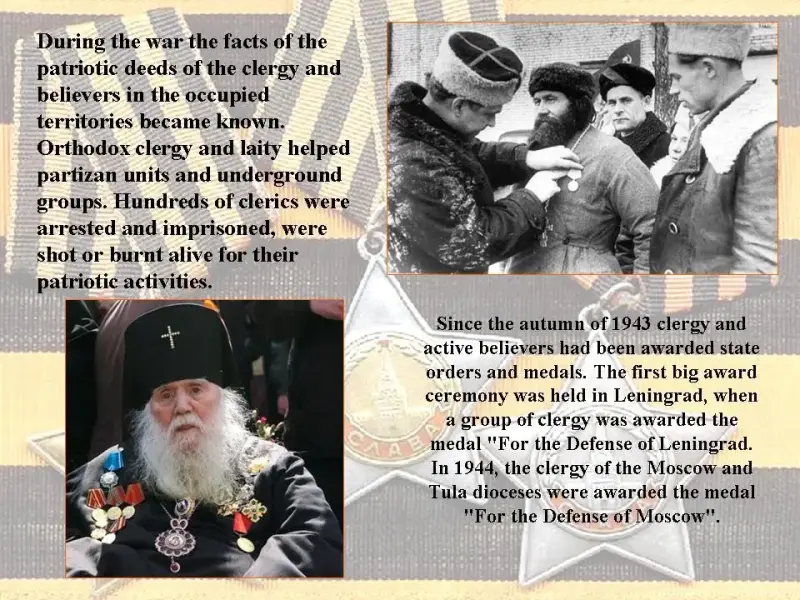 По мере наступления Красной Армии становились известными факты патриотических поступков духовенства и верующих на оккупированных территориях, где мн. православные священнослужители и миряне являлись связными, соратниками, помощниками партизанских отрядов и групп подпольщиков, а сотни священнослужителей за свою патриотическую деятельность подвергались арестам, тюремным заключениям, истязаниям, были расстреляны или заживо сожжены. Начиная с осени 1943 г. к награждению государственными орденами и медалями стали представляться священнослужители и активные верующие. Первое большое награждение состоялось в Ленинграде, когда группа духовенства была награждена медалями "За оборону Ленинграда". В 1944 г. медалями "За оборону Москвы" были награждены священнослужители Московской и Тульской епархий.