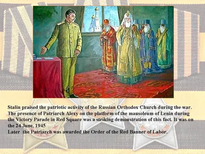 Сталин высоко оценил патриотическую деятельность РПЦ в годы войны, свидетельством чему стало присутствие Патриарха Алексия на трибуне мавзолея В. И. Ленина во время Парада победы на Красной площади 24 июня 1945 г. и несколько позднее - награждение Патриарха орденом Трудового Красного знамени.