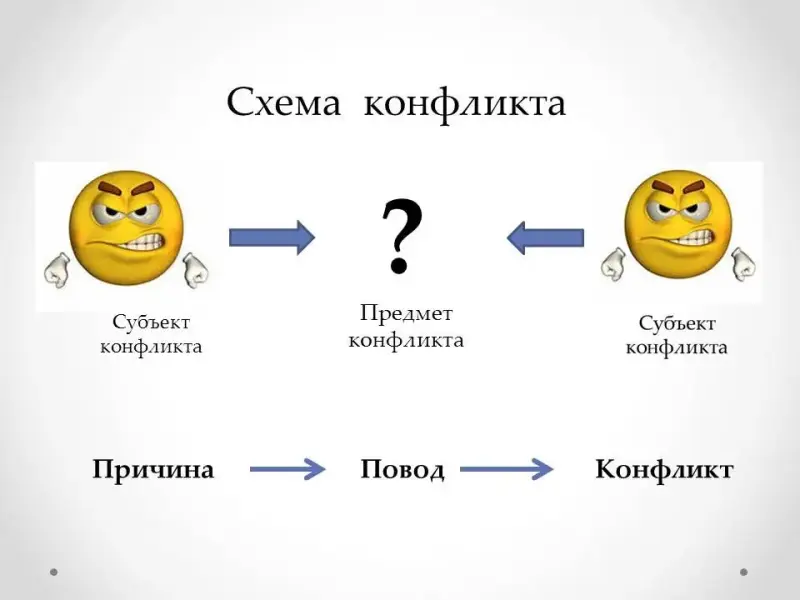 Так можно представить схему конфликта. Субъекты конфликта - участники, предмет - то, из-за чего произошел конфликтов.