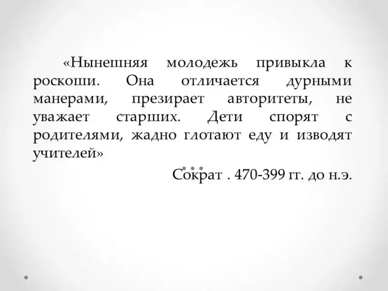 "Нынешняя молодежь привыкла к роскоши. Она отличается дурными манерами, презирает авторитеты, не уважает старших. Дети спорят с родителями, жадно глотают еду и изводят учителей". Сократ . 470-399 гг. до н.э.