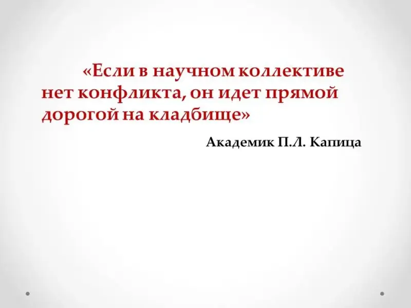 - Конфликты неизбежны. Но где-то они, по мнению некоторых, даже необходимы. Известный академик П.Л. Капица говорил: "Если в научном коллективе нет конфликта, он идет прямой дорогой на кладбище".