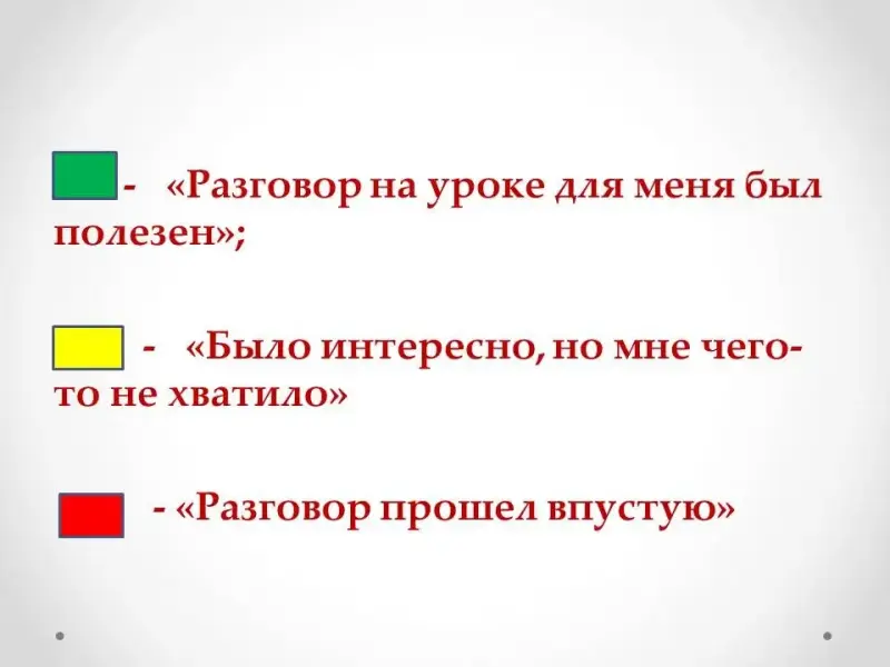 На этом урок окончен. Я хотела бы узнать ваше мнение по сегодняшнему уроку. Если вы считаете, что разговор на уроке был для вас полезен, когда будете уходить, оставьте на столах зеленые карточки. Если считаете, что урок был интересен, но вам чего-то не хватило - желтые, а если разговор для вас прошел впустую - красную карточку.