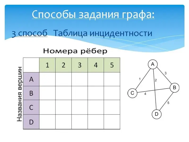 Названия строк таблицы инцидентности - названия вершин графа, названия столбцов - номера ребер графа. Эта таблица не является симметричной и не имеет главной диагонали.