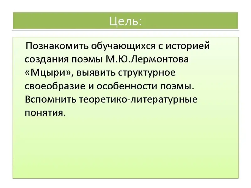 Цель: Познакомить обучающихся с историей создания поэмы М.Ю.Лермонтова "Мцыри", выявить структурное своеобразие и особенности поэмы. Вспомнить теоретико-литературные понятия.