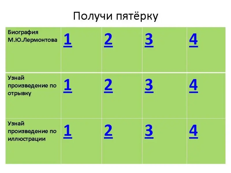 Учитель предлагает вспомнить ранее изученные произведения Лермонтова, узнать произведение по иллюстрации, вспомнить сведения по биографии писателя. | Учащиеся, выбрав задание, зарабатывают баллы, которые переводятся в оценку. | 5 мин. |