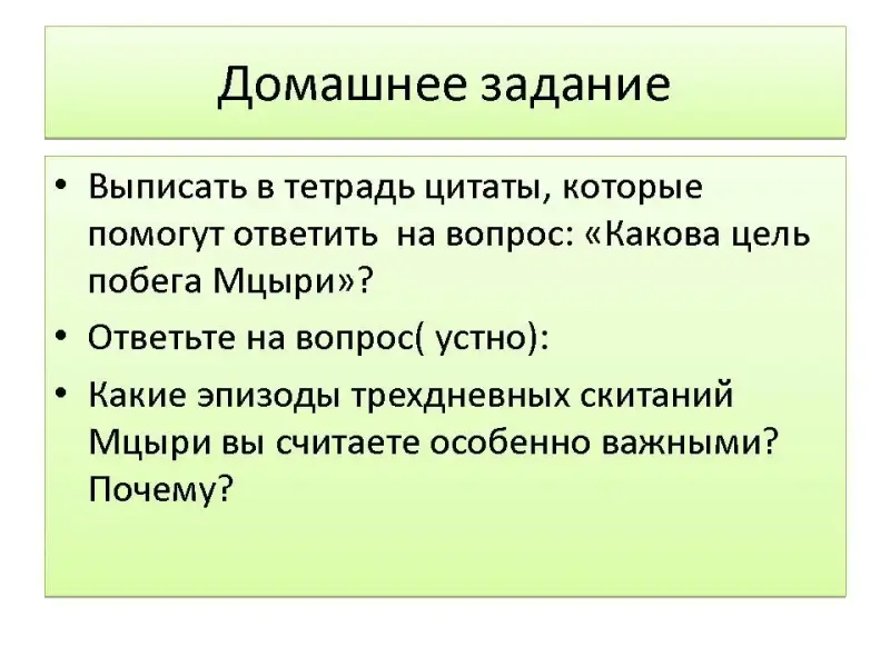 1.Выписать в тетрадь цитаты, которые помогут ответить на вопрос: "Какова цель побега Мцыри"? 2.Ответьте на вопрос( устно): Какие эпизоды трехдневных скитаний Мцыри вы считаете особенно важными? Почему? |