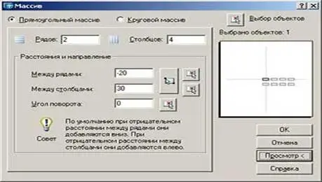 Прямоугольный массив - это размножение выбранных объектов вдоль двух перпендикулярных направлений. Диалог создания прямоугольного массива представлен на рис.1 Так как команда создания массива необратима (т. е. после его создания нет возможности изменить его параметры), существует возможность предварительного просмотра результатов- Рис. 1, 2.