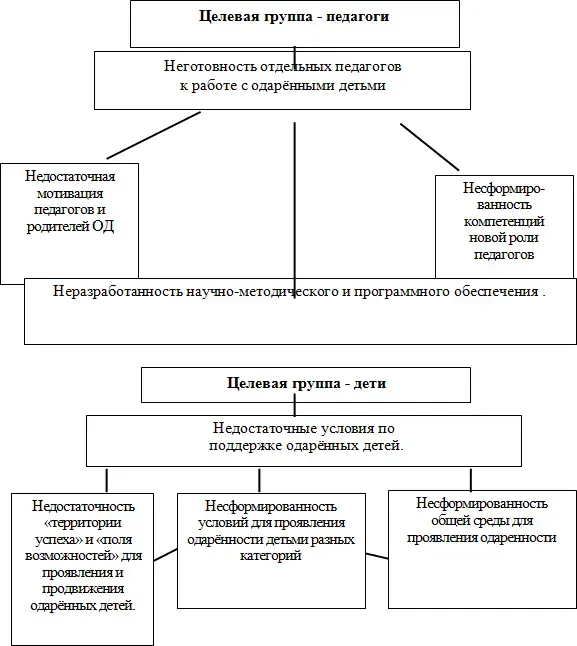 - несформированность (мотивационной, психологической, технологической) готовности учителей к работе с одарёнными детьми;